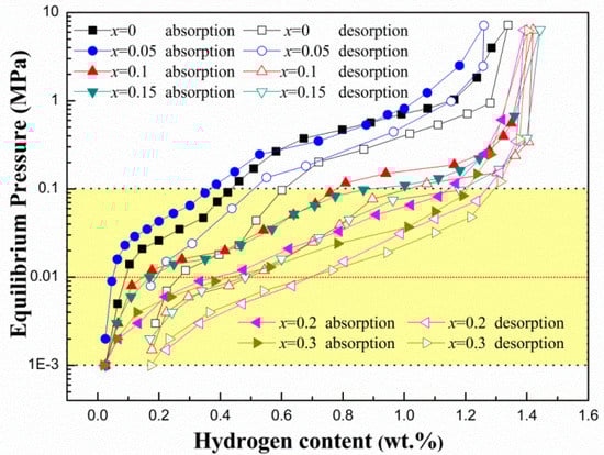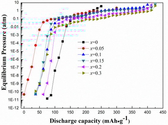 Pressure–composition isotherm (P-C-T) tests were performed using a Sieverts-type apparatus (Beijing Nonferrous Metal Research Institute, Beijing, China) at 298 K. Prior to formal measurements, powder samples were evacuated at 373 K and 1 × 10−4 Pa for at least 2 h in a resistance furnace to remove the impurities. In order to ensure that the sample was completely activated, the sample was hydrided under 8 MPa for 2 h and dehydrided at 0.001 MPa for approximately 2 h, several times.