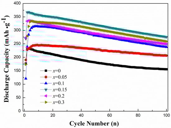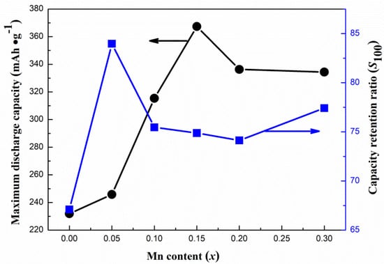 - With the increase in Mn content, the maximum discharge capacity of the alloy electrodes first increased and then decreased, from 231.9 mAh·g−1 (x = 0) to 367.4 mAh·g−1 (x = 0), and then decreased to 334.4 mAh·g−1 (x = 0). The maximum discharge capacity of the alloy electrodes is closely related to its hydrogen storage capacity at 0.1 MPa and its hydrogen absorption/desorption plateau pressure. The cyclic stability of all the Mn-containing alloy electrodes was improved distinctly compared to that of Mn-free alloy electrodes, because the volume mismatch between the [A2B4] and [AB5] subunits of each phase for series alloys became smaller after the addition of Mn, which improved the structural stability and reduced the corrosion of the alloys during the hydrogen absorption/desorption cycles.