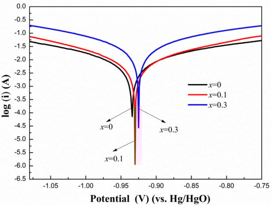 The capacity degradation of alloy electrodes is mainly ascribed to structural failure (hydrogen-induced amorphization, hydrogen-induced phase transformation, hydrogen-induced defects, stress-strain, etc.) and the electrochemical corrosion of active materials during cycling. Since Mn is mainly distributed in the [AB5] subunit, with the increase in Mn content, the mismatch between the [A2B4] and [AB5] subunits is reduced; meanwhile, the structural stability of the alloy electrodes during electrochemical cycling is enhanced. At the same time, in general, the micro-strain resulting from the lattice expansion/contraction can lead to the pulverization of the alloy particles during the hydrogenation/dehydrogenation cycles; as a result, more and more fresh surfaces of alloy particles are directly exposed to alkaline electrolytes, which will accelerate the corrosion of the alloy electrodes [42]. According to this study, with the increase in Mn, the mismatch between the [A2B4] and [AB5] subunits, micro-strain, and pulverization of alloys will all decrease, which reduces the corrosion of the alloys and improves the cycle stability of the alloy electrodes. Figure 12 shows the Tafel polarization curves of the alloy electrodes. It can be seen that with the increase in Mn content, the corrosion current density (icorr) decreased from 10.1 mA·cm−2 (x = 0) to 3.85 mA·cm−2 (x = 0.3) and the corrosion potential (Ecorr) decreased from −0.934 V (x = 0) to −0.925 V (x = 0.3), respectively. These results show that the addition of the Mn element reduces the corrosion behavior of alloy electrodes; this is consistent with the previous discussion. Hence, Mn-containing alloys will promote the cyclic stability of the alloy electrodes. From x = 0.1 to x = 0.3, the cyclic stability S100 of the alloy electrodes did not change significantly, all between 74.88% and 77.42%, which indicates that the crystalline structure of the alloy has been maintained well in the electrochemical charge/discharge process since x = 0.1.