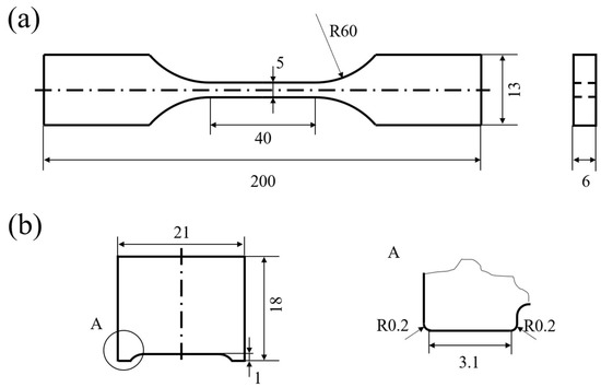 The geometries of the specimen and fretting pad are shown in Figure 1. These dimensions are prepared according to the JSME standard [39]. As can be seen from the figure, the fretting pad has two contact feet, and each of which has a 3.1 mm flat surface with rounded edges of R = 0.2 mm. This foot is in contact with the flat side of the dog-bone specimen (see Figure 2). The thicknesses of the dog-bone specimen and fretting pad are 6 mm. There are no edges in the thickness direction to ensure complete contact. Thus, the area of the contact surface is 3.1 × 6 mm2. All specimens and fretting pads were machined by wire electrical discharge machining, and the contact surfaces were both ground and polished to reduce the finish surface roughness (Ra = 0.4 μm).