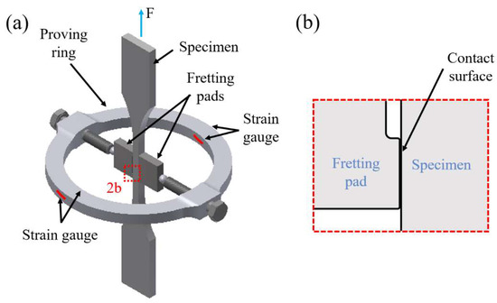 An experimental setup was designed to simulate the fretting contact condition, which is based on the JSME standard [39]. A schematic of the bridge-type fretting fatigue test apparatus is shown in Figure 2. Two fretting pads were pressed on the side of the dog-bone specimen. The proving ring and screw were used to apply the normal contact force between the specimen and fretting pads. The dog-bone specimen was mounted on the servo-hydraulic fatigue testing machine (Instron 8801). Then, the upper end of the specimen was fixed by the chuck, and the cyclic load was applied to the specimen along the length direction by the movement of the lower gripper. Hence, a total of four flat-on-flat fretting contact surfaces (Figure 2b) were formed between the specimen and fretting pads. This is a typical contact form for the fir-tree-type blade-disk attachment in the turbine engine. Since the contact was in plane strain state, the bending of the fretting pads was ignored. As shown in Figure 2a, four strain gauges were used to monitor the normal contact force, which are attached at the proving ring. These results of strain gauges revealed that the force value was changed only slightly during the testing. A strain gauge was installed between the fretting pad contact feet, and the tangential force (Ft) was calculated from the corresponding strain values. More detailed information about measurement methods can be found in the literature [39,40]. In this fretting fatigue test, these strain values were collected at a frequency of 1000 Hz.