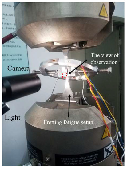 In this paper, the fretting fatigue test was carried out at room temperature. These test parameters are listed in Table 2. The normal contact pressure in the horizontal direction was chosen to be 90 MPa, according to the deformation of the proving ring, during which the screw is tightened. This roughly presents the normal contact pressure in the actual designs of the blade-disk attachment. A sinusoidal cyclic load with a frequency of 20 Hz was axially applied to the specimen. The stress ratio of the applied cyclic load was set as −1. In order to investigate the effect of cyclic load amplitude (Fa) on the fretting fatigue behavior, three different load levels (8.5, 7.3, and 6.5 kN) were used in our work. The nominal stress amplitudes corresponding to three different load amplitudes were 283.33, 243.33, and 216.67 MPa. Before the test, all contact surfaces were cleaned with acetone. Additionally, marks were made in the vertical and horizontal directions of the specimen. Then, the specimen position was adjusted in the camera field of view in order to ensure alignment. Each test was conducted until the specimen broke or the number of cycles reached 200,000.