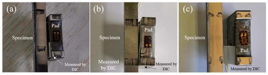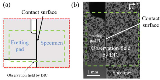 The DIC method was used to measure the full-field displacement at the contact region during the above fretting fatigue testing, which is a well-known established technique in experimental mechanics [41,42]. The complete test system is shown in Figure 3, which includes the fretting fatigue setup, optical device, and strain measurement equipment. It can be seen from the figure that the fretting fatigue setup was installed on the fatigue testing machine, and was axially loaded with periodical force. Two lights were used to improve image quality. The speckle pattern was spraying on the surface of the specimen and fretting pads, and the diameter of one black spot was approximately 50 μm. This change in speckle was monitored during each experiment by a camera with a resolution of 2448 × 2050 pixels (5 megapixels). Since four contact surfaces were similar, only the lower contact region (Figure 4a) was observed during the measurement. A rectangular field of interest was recorded at a rate of 1 Hz. As shown in Figure 4b, a contact surface was found in this observation view. The frequency of the fretting fatigue test was reduced from 20 to 0.05 Hz during DIC measurement. Therefore, about 20 image data points were measured in each fatigue cycle. The tangential force was measured at two frequencies (20 and 0.05 Hz). The results show that the difference in tangential force was relatively slight. Then, the displacement field can be calculated by the correlation algorithms based on the deformed image. Table 3 summarizes the postprocessing parameters. A subset of 101 × 101 pixels was used in this work, and the step was set as 15 pixels. Before the formal test, two images were continuously recorded when the fretting fatigue setup was at rest in order to determine the displacement measurement accuracy. Then, repeated measurements were carried out for the same static state. Based on the above postprocessing parameters, the measurement error of vertical displacement is less than 1 μm.