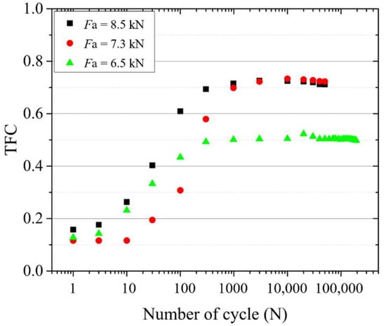 Figure 6 shows the evolution of the TFC during the test. In all load amplitude cases, the TFC at the initial stage was low, and their values were 0.1–0.2. This indicates that the slip occurs between the contact surfaces, which is caused by the high surface quality at the original state. Then, the TFC increases rapidly as the number of cycles increases. This large range of variation reveals that the wear appeared on the surface and the roughness deteriorated due to the slip on the contact surfaces at the beginning of the test. When the number of cycles reached about 1000, the TFC was gradually stabilized. This result reflects that the contact condition has become a stable state. On the other hand, the effect of cyclic load amplitude on the TFC response was also discussed in this paper. When the Fa reduced from 8.5 to 7.3 kN, the steady-state value of the TFC did not change, and their values were both between 0.71 and 0.72. However, as the load amplitude reduced to 6.5 kN, the steady-state value of the TFC was 0.5. Hence, for the 6.5 kN case, the contact surfaces were in a partial slip state. In turn, the gross slip condition appeared at the 8.5 kN case. It is worth noting that, based on the TFC alone, the state of the slip plane cannot be determined. However, according to the fretting scar, the gross slip occurred at the 6.5 kN test.