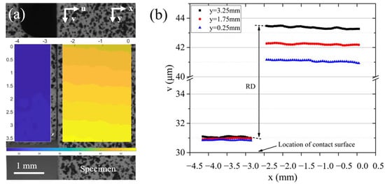 In order to describe the relative displacement between the contact surfaces, the distribution of vertical displacement along the x-direction is shown in Figure 7b. It can be seen that the displacement variation of the fretting pad along the x-direction was lower than the specimen. Additionally, the vertical displacement increases with the y-coordinate increases, which is consistent with the cyclic load applied by the movement of the lower chuck. Besides, there is a value jump due to the contact surface. Despite the lack of data near contact surfaces, the displacement still exhibits a linear law, as shown in Figure 7b. Therefore, the vertical displacement of the specimen and fretting pad on the contact surfaces can be determined by linear fitting. Furthermore, the relative displacement (RD) between the contact surfaces can be obtained in this study as follows: