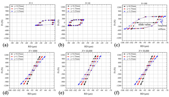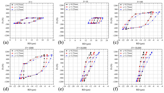 Hysteresis loops of tangential force (Ft) in a function of relative displacement (RD) for the 7.3 kN case: (a) N = 1, (b) N = 10, (c) N = 100, (d) N = 1000, (e) N = 10,000, and (f) N = 50,000.