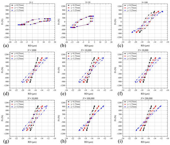 Hysteresis loops of tangential force (Ft) in a function of relative displacement (RD) for the 6.5 kN case: (a) N = 1, (b) N = 10, (c) N = 100, (d) N = 1000, (e) N = 10,000, (f) N = 30,000, (g) N = 50,000, (h) N = 100,000, and (i) N = 200,000.