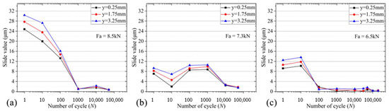 Relative slip is an important factor that characterizes the properties of fretting contact surfaces, and it is helpful to determine whether the contact point is stick or slip state. To illustrate the evolution law of relative slip, its change with the cycle number during the experiment at different cyclic load amplitudes is shown in Figure 11. It can be seen that there is a large relative slip at the beginning of the experiments. Then, for the 8.5 kN case, these values decrease sharply and stabilize as the number of cycles increases. This phenomenon indicates that the larger slide occurred in the initial stage. Additionally, with the further cycles, the slide between the contact surfaces decreases rapidly. This is because the debris adheres to the interface surfaces, which deteriorates the surface quality. When the state of the contact surface is stable, the variation of relative slip with the number of cycles becomes smaller. This is consistent with the evolution law of the TFC described above (see Figure 6). In addition, three curves of relative slip at different height positions (y-direction) are also shown in Figure 11a. Although the relative slip at y = 0.25 mm was lower than others, the evolution law of relative slip was still similar for the three curves. A more detailed discussion about the distribution of relative slip along the contact surfaces can be found later in Section 4.3.