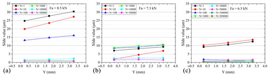 Figure 12a shows the distribution of relative slip along the y-direction throughout all tests at 8.5 kN in order to further recognize the slip or stick state of the contact position. It can be seen from the figure that all relative slips increase as the y-coordinate increases. Before 100 cycles, the relative slip of the contact surfaces all exceeded 5 μm. This indicates that all points on the contact surfaces were in a slip state, which is known as gross slip condition. It provides an explanation for the dramatic increase in TFC at the beginning of the experiment. Then, the relative slip decreased rapidly as the experiment ran. Since the higher relative slip was near the lower chuck (y = 3.25 mm), the upper side of the contact surface (y = 0.25 mm) became stuck earlier. In contrast, other positions on the contact surfaces were still in a slip state. Therefore, the contact condition changes from a gross slip to a typical partial slip at this moment. Furthermore, when the number of cycles was higher than 10,000, the relative slip of all points on the interface surfaces was less than 2 μm, as shown in Figure 12a. This result shows that the entire surface was in a sticky condition after 10,000 cycles.