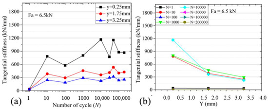 In order to further explore the contact properties under the fretting fatigue condition, the tangential contact stiffness obtained from the hysteresis loops is shown in Figure 13. Clearly, the tangential stiffness increased with the number of cycles at Fa = 6.5 kN during the experiment, as shown in Figure 13a. One of the possible reasons for this effect was the increase in contact area throughout the test. Figure 13b shows the variation in tangential stiffness versus the y-coordinate for the 6.5 kN case. It can be seen from the figure that there was a higher tangential stiffness at y = 0.25 mm (near the lower chuck). This nonuniform distribution of stiffness can reflect the variation of contact pressure along the interface surface. In detail, the contact pressure decreases as the y-coordinate increases. This is consistent with the increase in relative slip along the contact surfaces for all tests. These results about tangential contact stiffness were also investigated by Kartal et al. [29].