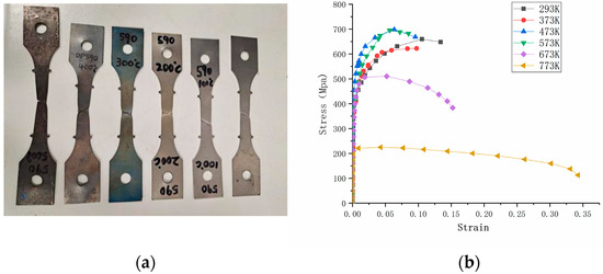 (a) Specimen test diagram and (b) engineering stress–strain curve of DP590 steel at different temperatures.