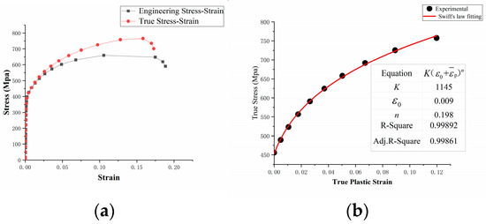 We use Equations (1) and (2) to convert the engineering stress–strain curve obtained from the test into the real stress–strain curve.