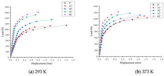 According to the damage parameters determined above and the introduced correction function, we numerically simulate the shear specimens with different temperatures and angles, and extract the load–displacement curve (Figure 20).