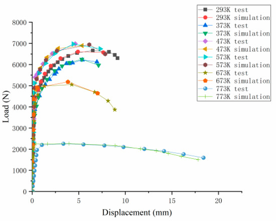 According to the above damage parameters, we write VUMAT subroutine and use ABAQUS software to simulate the damage parameters at different temperatures. We compare the load displacement curve obtained by numerical simulation with the test load displacement curve, and the results are shown in Figure 8.