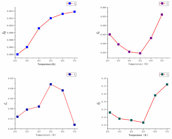 By comparing the curves, we found that the maximum error of the curve is 4.72%. Therefore, it can be considered that the GTN damage parameters obtained by numerical simulation combined with the test and RSM experimental design are accurate and can be used to predict the failure of unidirectional tensile specimens at different temperatures. Figure 9 shows the variation law of void volumerelated damage parameters with temperature.