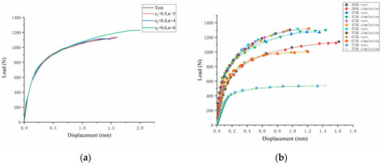 The shear damage introduced into the extended model is an important state variable. The evolution of shear damage is affected by the material shear damage softening parameter n and effective failure strain. The shear parameters were calibrated by shear test and numerical simulation. Taking 293K as an example, the load–displacement curve under two parameter sets (Figure 10) and other model parameters take the above given values, and finally determine the value of n and at different temperatures.