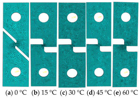 According to the shear tests and the damage parameters calibrated above, the numerical simulation of uniaxial tensile shear test is carried out for shear specimens from other angles. In order to better capture local deformation and damage, refined meshes and coarse meshes are used inside and outside the central region respectively. The size of the refined mesh is 0.2 mm × 0.2 mm, and the size of the coarsened mesh is 0.8 mm × 0.8 mm. Updated Lagrange formulations were used to handle the geometrical and material nonlinearities, and mass scaling factor was set to 20 so as to reduce the total simulation time. Fixed constraint was imposed at the bottom of the samples and the displacement loading was implemented on the top boundary. The finite element model of the test piece is shown in Figure 11.