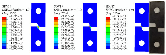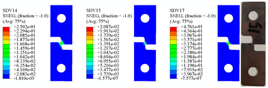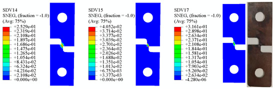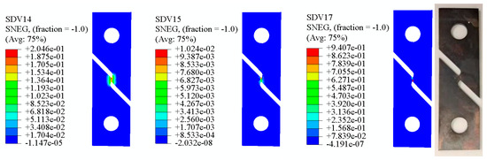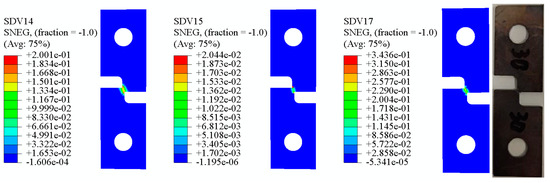 It can be seen from the above Figure 12, Figure 13, Figure 14, Figure 15, Figure 16 and Figure 17 that in the 0° tensile test, the shear damage starts at both ends of the sample notch and propagates to the center, and the crack propagation direction is parallel to the loading direction. With the increasing of specimen, the influence of shear damage becomes smaller and smaller, the initial position of shear damage gradually shifts to the center, and the crack propagation direction also develops vertical to the loading direction. When any variable of shear damage or void volume damage reaches the critical value, the material will fail.