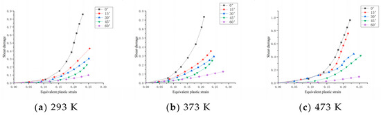 Through numerical simulation, changes in void volume damage and shear damage at different temperatures are obtained. It can be seen from the above Figure 18 and Figure 19 that for samples with the same temperature and different angles, the influence of void volume damage on material damage increases with the increase of shear angle. This is consistent with the gradual development of fracture form from shear fracture to tensile fracture. For the shear specimen with the same angle, when the temperature changes from 293 K to 573 K, the void volume damage value is small under the same equivalent plastic strain. When the temperature changes from 573 K to 773 K, the void volume damage value will gradually increase. This shows that when the formability of DP590 becomes better, the void volume damage has a great influence on the failure of DP590.