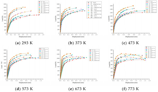 Comparison between numerical simulation and test load–displacement curves at different temperatures (a–f).
