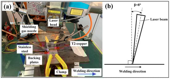 The experimental setup and schematic diagram of laser welding of copper to stainless steel: (a) the experimental setup; (b) the schematic diagram of the welding process.