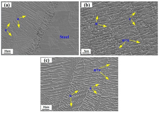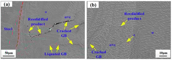 As shown in Figure 2a, slender columnar crystals are generated near the fusion zone of steel side. The growth of these crystals mainly depends on a larger temperature gradient along a certain direction. Only a few ε phases emerge at the grain boundary. The segregation of precipitated phases mainly lies on liquid separation reactions due to the great difference in physicochemical properties [28]. During the solidification of the weld, the α phase with the high melting point was preferentially precipitated and grew up quickly, whereafter the ε phase and inclusions with low melting points were formed at the grain boundaries. The structure inhomogeneity easily results in the anisotropy for the joint mechanical properties. The major defects near the fusion line were found to be cracks and microcracks. The continuous or semi-continuous cracks appeared in the weld zone (WZ), spreading along the grain boundary direction. It can be observed that liquated films occurred at grain boundaries, but the cracks failed to be generated during the laser welding process. The occurrence of intergranular cracking mainly depends on metallurgical factors and mechanical factors. For mechanical factors, it can be directly determined by the competition results between intergranular cohesive and the thermal stress at interface. For metallurgical factors, it can be also influenced by grain size, grain boundary misorientation [29] and multi-component segregation [30].