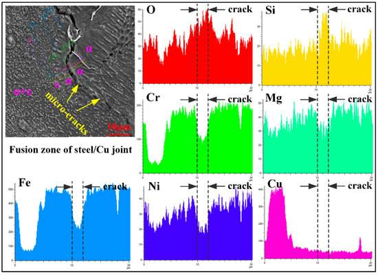 From the EDS results in Figure 3, it is clear that significant composition segregation takes place in the fusion zone (FZ) during the solidification process. It can be observed clearly that the irregular cracks, together with liquated films or inclusions, appear at the grain boundaries. It can be also discovered that, in comparison with intragranular element content, the oxygen and silicon element contents in the crack increase significantly; the copper element content remains largely stable; and iron, chromium, and nickel element contents diminish drastically. The grain boundary involves more oxygen atoms, proving that the intergranular oxidation resistance is much weaker than the intragranular oxidation resistance. More seriously, the penetration of oxygen along grain boundaries can induce the emergence of grain boundary cracking [31]. The enrichment of silicon atoms means that the strength of α-Fe solid solution can be greatly enhanced by the effect of solution strengthening, leading to a reduction of toughness and a plasticity of materials. The evolution characteristics of the copper element mainly depend on its segregation during the solidification process. The first peak value is as a result of ε-Cu precipitation. Rich Fe areas are formed near the ε-Cu phase. An introduction of alloying elements such as Cr and Ni can improve the strength of solid solutions. Moreover, the presence of Cr at grain boundaries can effectively heighten intercrystalline oxidation resistance. The second peak value can be attributed to the migration of copper atoms along the grain boundary. Compared with α-Fe phase, the ε-Cu phase has a lower melting point. During the weld cooling process, liquated grain boundaries can be easily produced because of the generation of precipitated phases with a low melting point at grain boundaries, greatly reducing the binding force between the grains and increasing the grain boundary cracking susceptibility. As thermal stresses fail to be thoroughly eliminated by plastic deformation itself, the solidification cracking easily occurs at grain boundaries. Therefore, we determined that the occurrence of solidification cracking might be the result of the composition segregation. In order to inhibit the solidification cracking effectively, some measures should be adopted during the laser welding process to regulate precipitated phases such as low-melting-point phases or inclusions and subsequent gradient microstructures in the FZ.