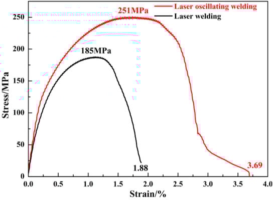 The tensile properties of the tested samples under different processes are presented in Figure 5. As shown in Figure 5, the tensile strength of tested samples using laser oscillating welding is 251 MPa, 35.7% more than 185 MPa using laser welding. Meanwhile, the strain of tested samples using laser oscillating welding is 3.69, 96% more than 1.88 using the laser welding. The improvement of joint strength mainly depends on the microstructures of the welds. As seen from Figure 4a,b, fine columnar crystals instead of coarse dendrites are produced in the fusion zone because of the stirring effect of the oscillating laser. Grain refinement can significantly increase the area of the grain boundary. Under external force, dislocation motion is hindered at the grain boundary because of large distortion energy. The entanglement of the dislocation can greatly improve the deformation ability of the material and endure a greater force. In addition, the refined grains can effectively reduce stress concentration at the grain boundary, resulting in the inhibition of the occurrence of cracks at the grain boundary and a quick extension along the grain boundary. In such a condition, the strength and toughness of the joints can be enhanced significantly. Compared with the steel/copper joints with the tensile strength of 220 MPa obtained by laser additive manufacturing [15], the tensile strength of 251 Mpa is higher using laser oscillating welding.
