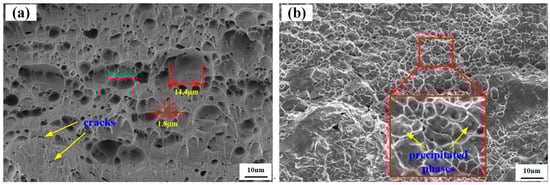 Figure 6 shows fractographs of tested samples at room temperature under different welding processes. As shown in Figure 6a, it can be clearly observed that multi-size dimples and torn edges emerge in joint fracture. The size of dimples varies from 1.8 μm to 14.4 μm. The emergence of typical features is closely associated with the microstructure in the welds. The microstructure mainly consists of α-Fe and ε-Cu in the weld zone. The hardness of the precipitated α-Fe phase is higher than that of the precipitated ε-Cu phase. Generally speaking, the presence of precipitated phases with high hardness can lead to the stress concentration, so it is quite adverse to the plastic deformation of the material. Moreover, the inhomogeneous distributions of these precipitated phases easily lead to the anisotropy of the mechanical properties of materials, which significantly induces the occurrence of the cracks.