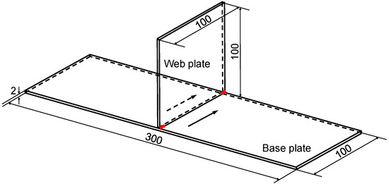 During welding assembly, the deformation of thin-walled parts is occurring. To investigate the mechanical properties of the T-welded joint under welding deformation, before the actual welding assembly for T-joint thin-walled parts of 2 mm, the red zone of the two sides of the web plate and the base plate are connected and fixed through spot welding, as shown in Figure 1. Therefore, when the welding characteristics of T-joint thin-walled parts are analyzed through FE simulation, the fixed constraint zones are the red zone of the two sides of the thin-walled parts through fixing nodes of the red zone of two sides for the FE model.