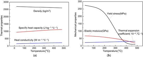 Simultaneously, according to the relative parameters in [33], the variation curve for the thermal and mechanical characteristics of Al6061-T6 depending on the temperature is shown in Figure 2. To obtain the temperature variation of the welding and cooling process using ABAQUS, the Stefan−Boltzmann constant and the convective heat transfer coefficient were set as 5.68 × 10−8 and 80 J/(m2·s·°C), respectively. Simultaneously, the latent heat was 3.9 × 105 J/kg, and the solidus temperature and liquidus temperature were, respectively, 585 °C and 659 °C. In addition, Poisson’s ratio is always 0.33 with temperature.