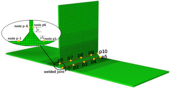 Additionally, to better understand the variation of welding deformation, residual stress, and temperature for different welding currents, a series of nodes (p1–p10) near the second weld obtained according to the welding sequence in Figure 4 were chosen to analyze the welding characteristics of T-joint thin-walled parts. For those key nodes near the weld, the distance from the weld edge line was 2 mm on the enlarged view of the T-welded joint in Figure 4. In this work, the nodes p3 and p8 were taken as examples to analyze the variation of welding properties, and their variation curves are shown in Figure 6.
