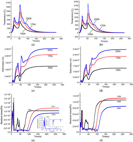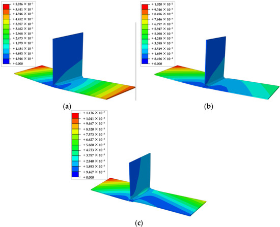 According to the abovementioned conditions, the welding deformation and residual stress distribution of T-joint thin-walled parts after ending the cooling time were obtained through FE simulation, as shown in Figure 5. In Figure 5, it can be obviously seen that the T-joint thin-walled parts were subjected to different extents of deformations and warpage of the base plate during the welding process. From the perspective of maximum value, the maximum deformation value was about 5.94, 10.20, and 11.36 mm when the welding currents were 100, 170, and 220 A, respectively. At this point, the warpage degree of the base plate was the largest for the welding current of 220 A. These results show that when other welding process parameters remained unchanged, the welding deformation increased with the increment of the welding current. Namely, according to the Equation (3), when the welding current increases, the heat input is also increasing, and the welding deformation increases to a certain degree.