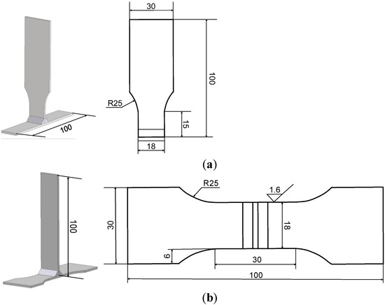 Two tensile test specimens: (a) the first tensile test specimen with dimensions and (b) the second tensile test specimen with dimensions.