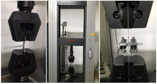 Regarding the preparation of the tensile specimens, two tensile test specimens obtained from the T-joint thin-walled parts under conditions of different welding currents were cut by a wire-cutting machine tool, as shown in Figure 7. A total of 9 samples were subjected to tensile testing to obtain more accurate results in accordance with relevant standards, and the cross-section area of the specimens was 18 mm× 2 mm. Additionally, the specimens were clamped with fixtures on the SANS electronic universal testing machine, and the tensile rate was 1 mm/min, as shown in Figure 8. As a result, the force-displacement data for the acquired specimens under different welding current were obtained. Then, the true stress–true strain values were calculated by the following formulas [37]: