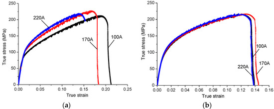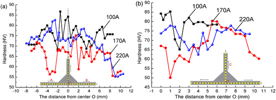 In Figure 15a, for welding currents of 100, 170, and 220 A, minimum Vickers hardness values of 68.4, 56.3, and 71.3 were obtained at approximately 2, 3.5, and 7.5 mm along the A direction. Along the B direction, the minimum Vickers hardness values of 68.7, 55.2, and 55.2 were respectively located at about 3.5, 9, and 9.5 mm. In Figure 15b, minimum Vickers hardness values of 65.1, 50.1, and 62.4 were respectively obtained at approximately 2, 1, and 4 mm along the C direction for welding currents of 100, 170, and 220 A. These results show that the Vickers hardness value greatly changes for different welding currents or heat inputs, and the minimum hardness value occurred in the HAZ. Moreover, with a higher heat input, the Vickers hardness value and strength decreased in the HAZ.