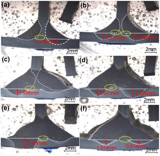 Macrographs of the T-welded joint with penetration depth size: (a) 100 A-1, (b) 100 A-2, (c) 170 A-1, (d) 170 A-2, (e) 220 A-1, and (f) 220 A-2, where 100 A-1 and 100 A-2 denote, respectively, the welded joint specimens of two zones (numbered 1 and 2) cut by a certain distance on the T-joint thin-walled parts under a welding current of 100 A, and the other symbols are the same for 170 and 220 A.
