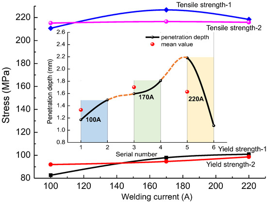 According to metallographic observation, the cross-section macrographs of two T-welded joints for each welding current were obtained using the stereoscopic optical microscope, as shown in Figure 10, and the specific welding penetration depth size was measured by ImageJ software. Moreover, the degree of lack of root penetration for the T-welded joint specimen was obviously visible. According to the abovementioned tensile results of the T-welded joint, the tensile properties and penetration depth curves with welding current variation are shown in Figure 11.