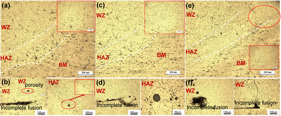 Microstructure features from the BM to WZ and welding defects: (a,b) 100 A, (c,d) 170 A, and (e,f) 220 A.