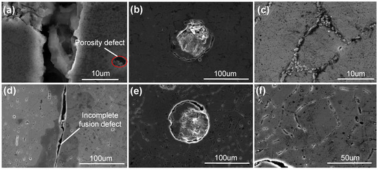 Welding defects of WZ and HAZ using SEM. (a–c) The incomplete fusion defect, porosity defect, and grain boundary morphology of WZ at 100 A. (d–f) The incomplete fusion defect for WZ, porosity defect for HZ, and grain boundary morphology of WZ at 170 A.