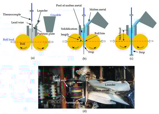 Schematic showing how the thermocouple was inserted into the molten metal pool and incorporated into the strip during casting: (a) rolls are rotating at a designated speed, and a lead wire is set between the rolls; (b) strip drags the lead wire; (c) thermocouple passes through the molten metal pool and is incorporated into the strip. (d) Photograph of (b) from overhead.