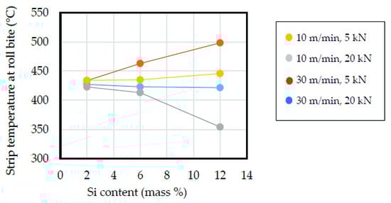 Effects of roll speed, roll load, and Si content on strip temperature at roll bite. Roll speed: 10 m/min and 30 m/min; roll load: 5 kN and 20 kN; Si content: 2%, 6%, and 12%.