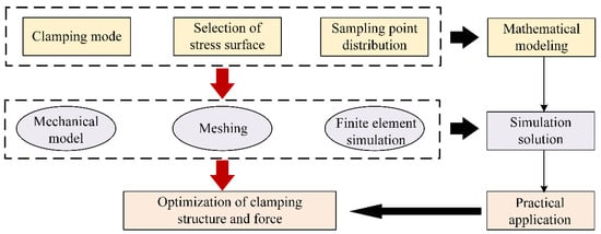In this section, the research work was carried out with three aspects: establishing a mathematical model for part clamping scheme optimization, finite element simulation of clamping deformation, and clamping optimization. The clamping deformation was predicted for the cabin parts. Then, the optimization design for the clamping scheme was carried out. The overall technical scheme of clamping deformation analysis based on clamping force control is shown in Figure 1.
