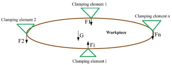 In order to ensure the stability of part clamping and weaken the influence of clamping deformation on machining accuracy, a force analysis model of a clamping workpiece was established as shown in Figure 2. F1, F2, Fi and Fn in the Figure 2 were the clamping force exerted by the clamping element on the workpiece, and G was gravity.