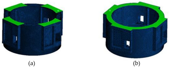 As shown in Figure 3, the pressure from the pressing plate was loaded on the corresponding node of workpiece, and all its degrees of freedom was limited. In light of the actual processing requirements, two clamping strategies were formulated as follows: (1) select four stacked areas at top of cabin to press the pressure plate; and (2) press the pressure plate on the whole surface of the top area of the cabin. The loading position is shown in Figure 3.