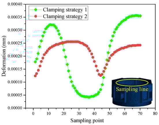 On the inner circumference of the upper surface, the sampling curve and simulation results of inner circumference were obtained as shown in Figure 6. It can be seen that the deformation in strategy 1 and strategy 2 was small, and the deformation trend was almost same. Therefore, in order to ensure high-precision machining accuracy, it was more advantageous to use clamping strategy 2. In the actual tooling design, clamping strategy 2 was commonly used for clamping tooling design.