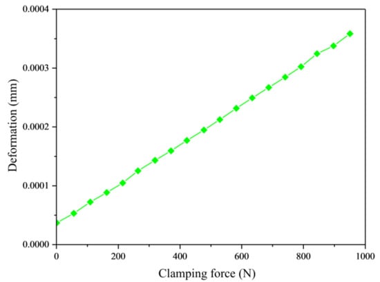 The amount of deformation increased with the increase in clamping force. When the clamping force increased to a certain value, the amount of deformation was close to the maximum allowable error. Therefore, the maximum allowable clamping force was selected by setting the maximum threshold of clamping deformation.