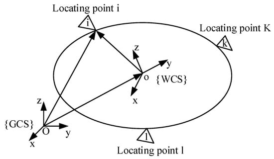 The principle of the zero-position system was essentially the mapping relationship among the number of specified points, the layout of the positioning points, and the position of the workpiece. The positioning scheme is shown in Figure 8. The global coordinate system was assumed as GCS, and the workpiece coordinate system was a moving coordinate system consolidated on the workpiece (WCS). The workpiece surface was composed of separable smooth surfaces. The point coordinates were converted to the {GCS} coordinate system. Then, the surface equation of the workpiece surface under the coordinate system {GCS} can be obtained. The positioning point was in contact with the workpiece surface when the workpiece was at the theoretical position.