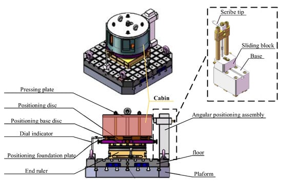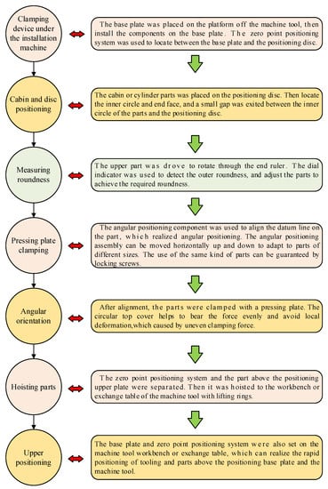 The off-machine clamping alignment of the cabin section used the ball lock structure of the zero-point positioning system to realize the positioning between the upper plate of the positioning foundation and the positioning disc. The cabin section and the positioning disc were aligned, taking the inner circle and end face of the cabin section as the benchmarks to carry out positioning. Then, we kept the positional relationship among the upper plate of the positioning base, the positioning disc, and the parts of the cabin section unchanged. The end ruler under the positioning upper plate was rotated to drive the cabin section, the positioning disc, and the positioning base plate to rotate. Meanwhile, we aligned the reference line on the parts horizontally or moved the angular positioning assembly up and down to realize the angular positioning of the cabin section under the machine. Finally, we separated the upper part of the positioning upper plate from the bottom plate and moved it to the machine. With the help of the zero-point positioning system, the space position between the cabin section and the machine tool could be realized. The specific operation process is shown in Figure 13.