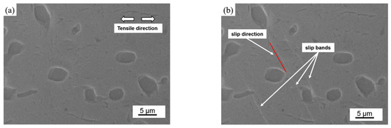 The stress-displacement curve of the solution-treated Ti-22Al-25Nb alloy is shown in Figure 4. Each turning point in the curve represents a short pause for observation and the tensile process will be continued after the observation. As can be observed in Figure 4, there are four stopping points at the elastic deformation stage, and only one stopping point (marked as the first) is recorded because of no significant difference in the microstructure among the four turning points before yielding. From the second stop point to the seventh stop point, the alloy is in the yielding stage. According to the in situ tensile curve in Figure 4, the yield strength (YS) and ultimate tensile strength (UTS) of the alloy with equiaxed α2 particles are 574 MPa and 601 MPa, respectively. The overall elongation of the alloy is 8.23%. Microstructure observations of the in situ tensile process according to different stages in Figure 4 are shown in Figure 5. The microstructural morphology has undergone a series of major changes during the in situ tensile deformation. At the elastic deformation stage (Figure 5a), the microstructure had no obvious change from that after solution treatment. When the in situ tensile process reached the second and third stages (Figure 5b,c), a few wide slip bands appeared in the B2 matrix and no slip bands occurred in α2 particles, indicating that deformation preferentially occurred in the B2 matrix to relieve the stress. At that time, the distance (marked by the blue lines) between the two narrower adjacent slip bands is about 3.8 μm. As the tensile displacement increased (Figure 5d), more inhomogeneous slip bands occurred in the B2 matrix and the former slip bands became more well-defined. When the tensile process reached the fifth stage (Figure 5e), a large number of slip bands including cross-slip bands existed in the B2 matrix and the distance (marked by the blue lines) between two adjacent slip bands was reduced significantly to approximately 1.5μm. This indicates that continuous plastic deformation occurs in the B2 matrix and the appearance of cross slip bands is beneficial for releasing the stress caused by dislocation piling up [33]. Meanwhile, some of the slip bands shear the smaller α2 particles, while more slip bands were blocked by α2 particles, especially the larger ones. This indicated that larger α2 particles hinder the movement of the slip bands, while smaller α2 particles have a limited hindering effect on the movement of the slip bands. In other words, while a large number of slip bands appeared in the B2 matrix, only a few appeared in the α2 particles. It revealed that the plastic deformation of the alloy during the tensile process is mainly contributed to by the B2 phase. That is consistent with the results proposed by Boehlert [12] that the B2 matrix can enhance the plastic properties of the Ti2AlNb-based alloy compared with the O phase and the α2 phase. It is known that the B2 phase as a body-centered cubic (BCC) structure phase has three independent slip systems [17], such as {110}<111> slip systems, {112}<111> slip systems and {123}<111> slip systems. Each independent slip system has lots of equivalent slip modes. Therefore, during the tensile deformation of the alloy, there can be more activated slip systems in the B2 phase to relieve the stress concentration. It should be noted that the direction of the slip bands (marked by the red line in Figure 5b) from Figure 5b to Figure 5e appearing in the B2 matrix is basically identical. This is because the deformation occurs within a single B2 grain and only one slip system is activated for dislocation slipping in the B2 grain.